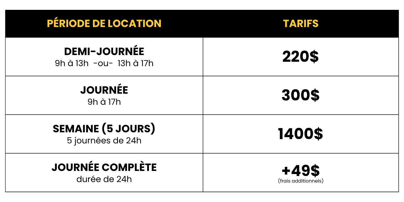 - Assurance de base incluse, avec protection collision (franchise de 2 500 $ + transport)